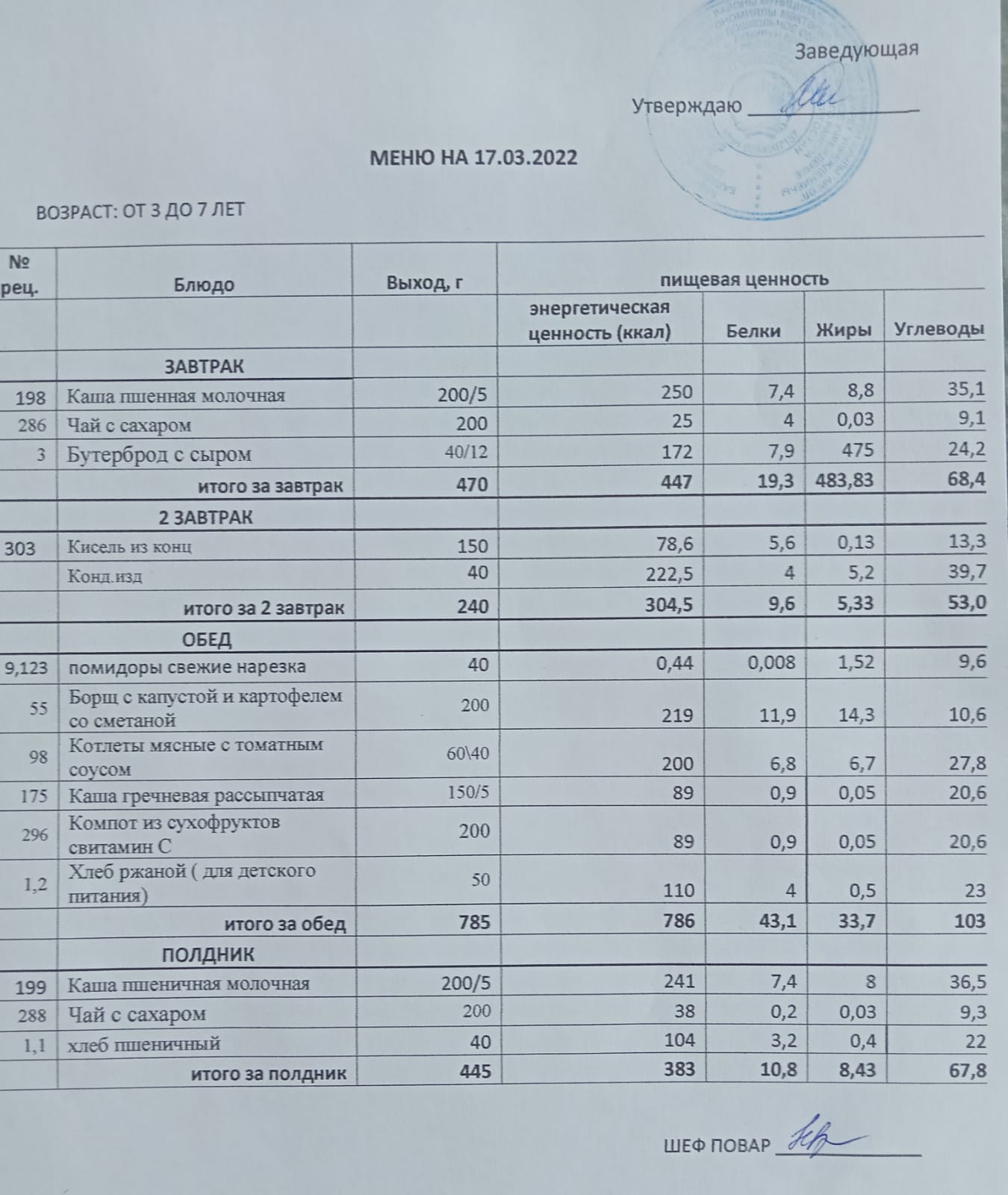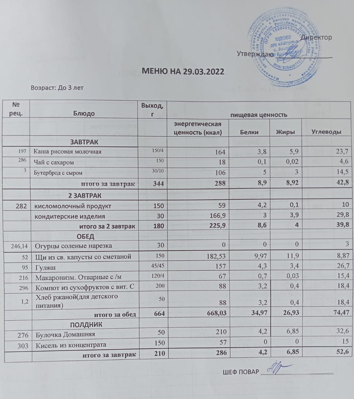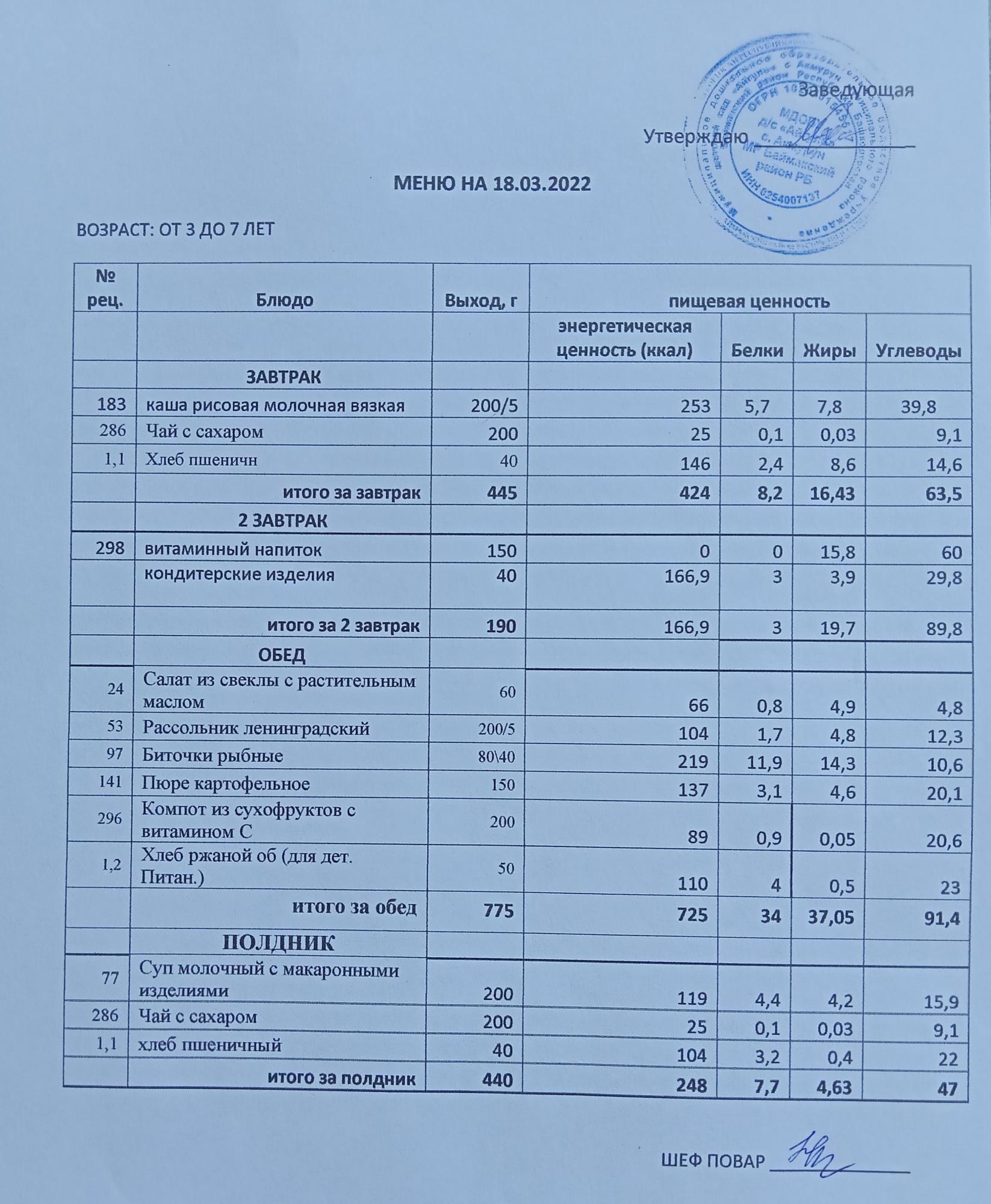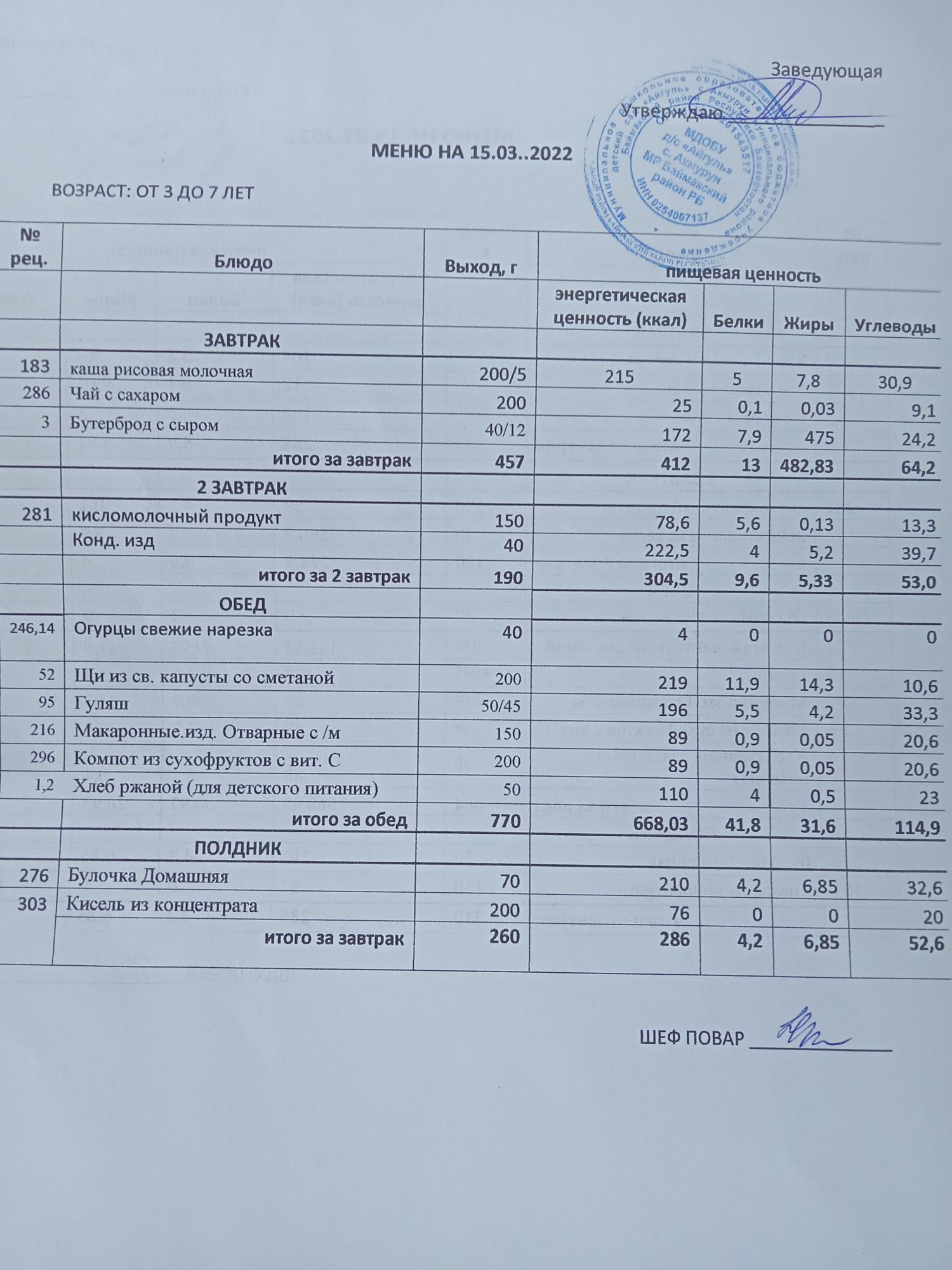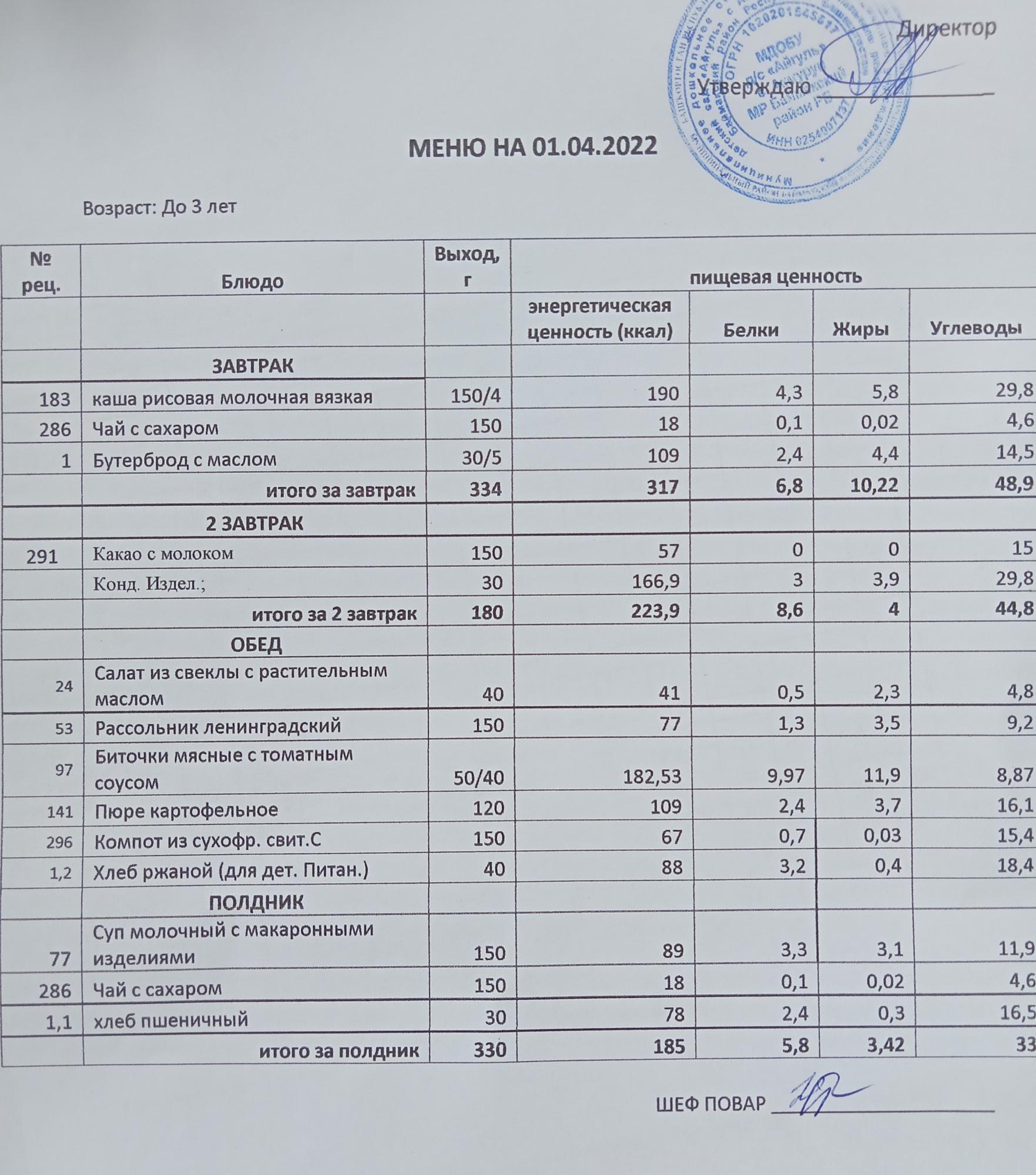 Примерное меню для ДОУ