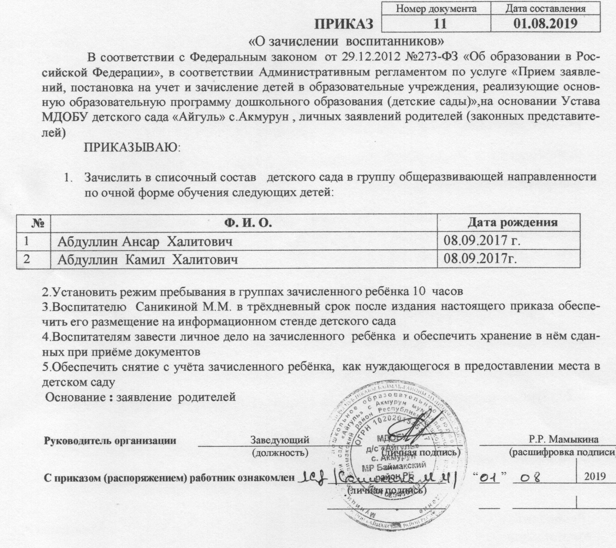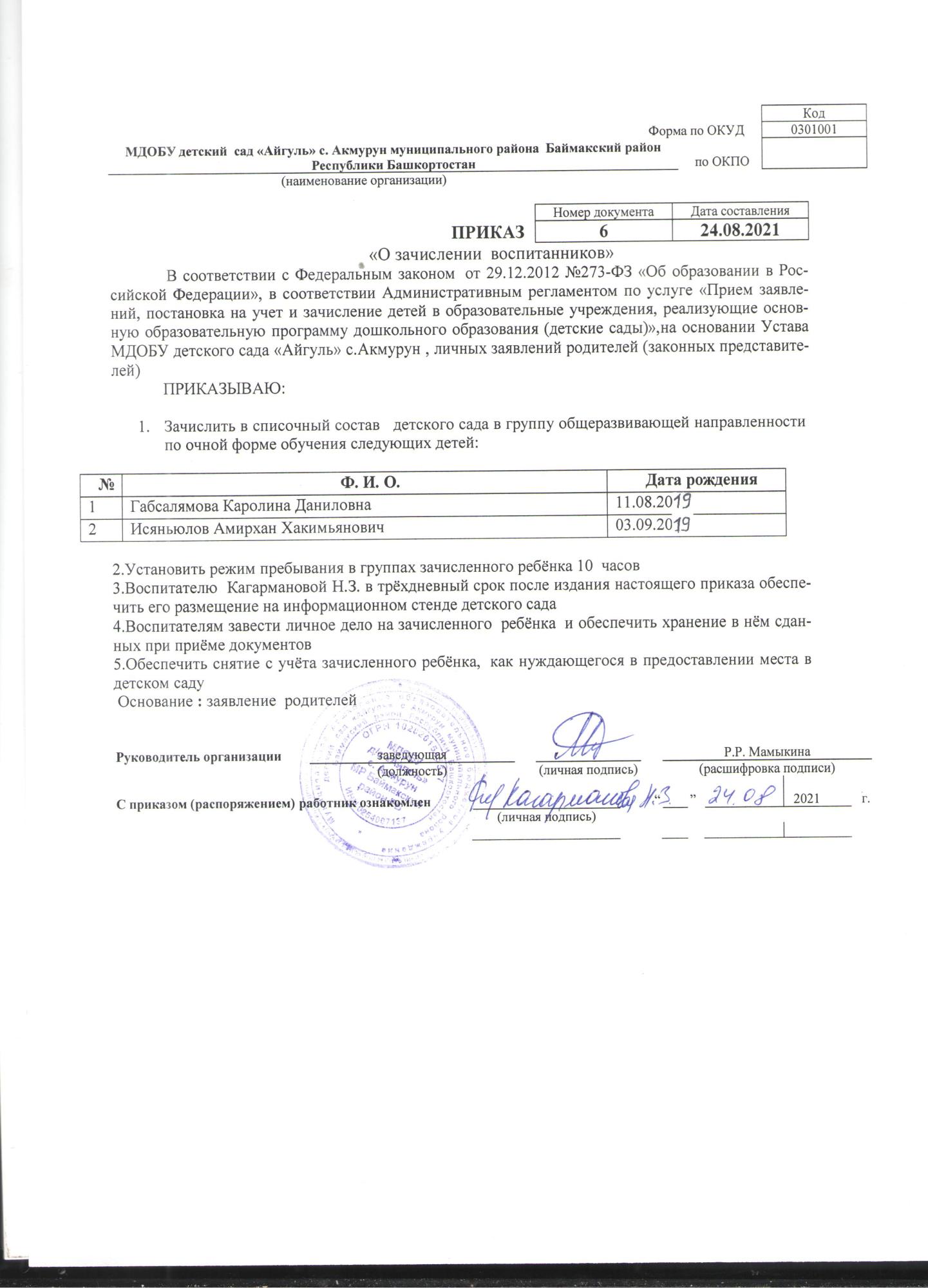 Приказ о зачислении Исяньюлова Амирхана и Габсалямовой Каролины