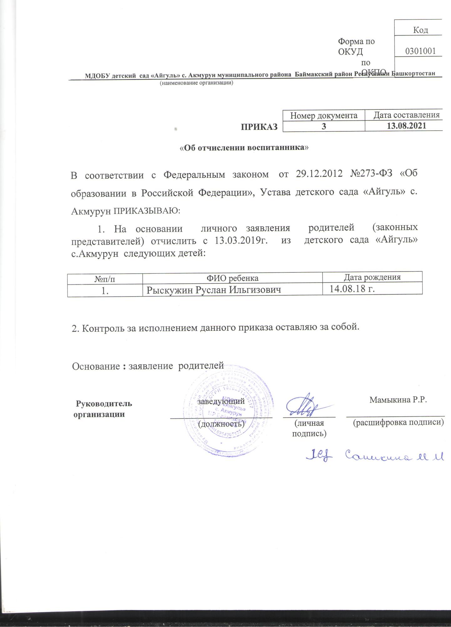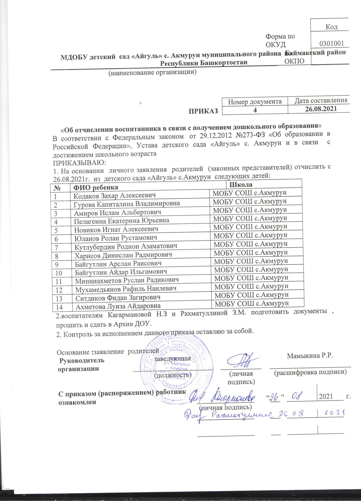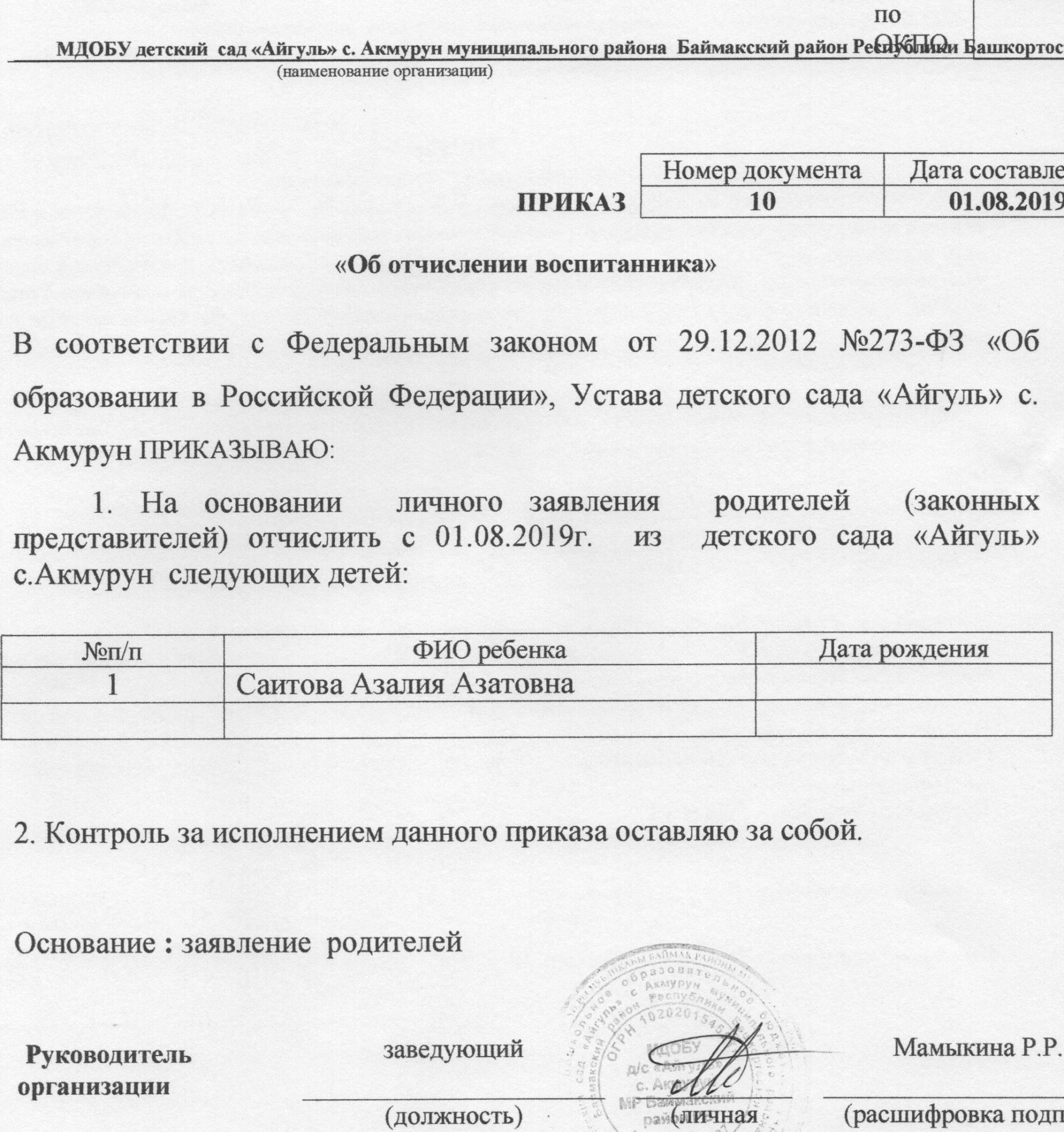 Приказ об отчислении воспитанников в связи с получением дошкольного образования