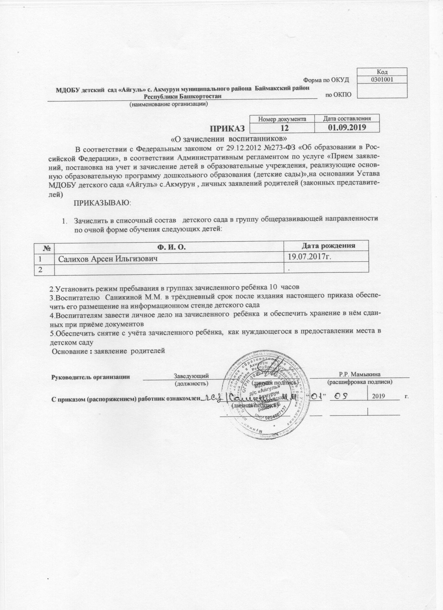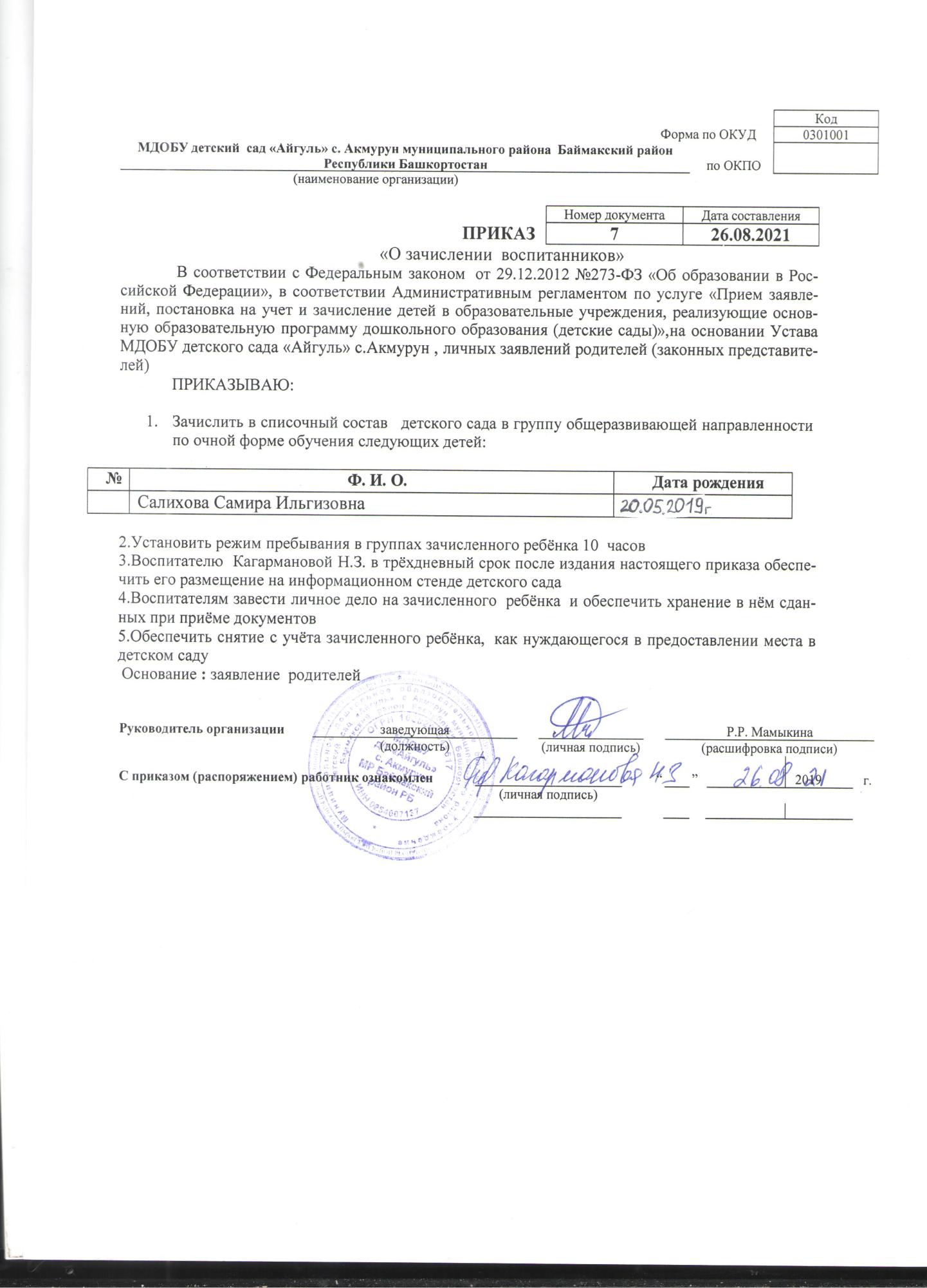 Приказ №7 о зачислении Приказ о зачислении Салиховой Самиры