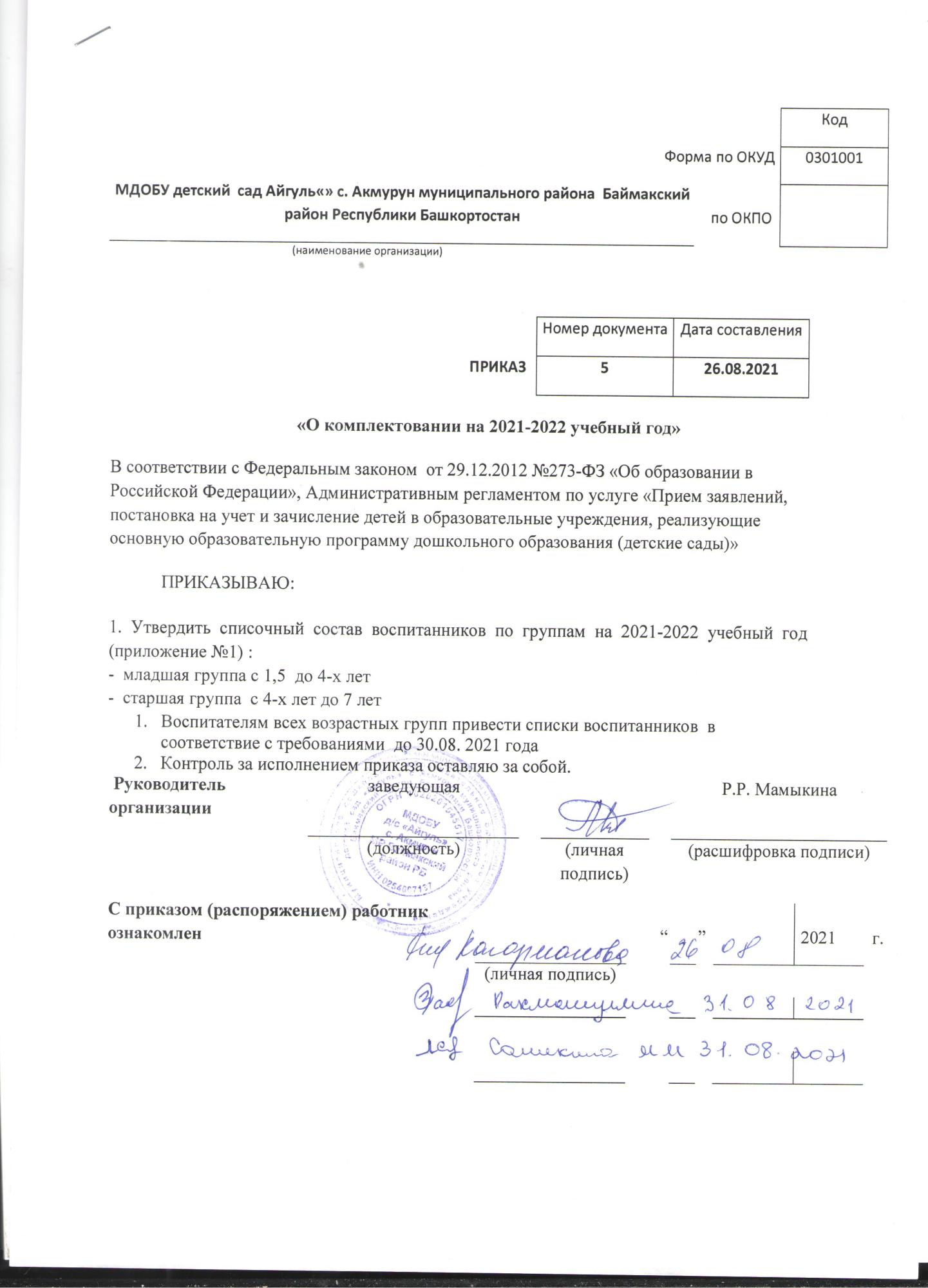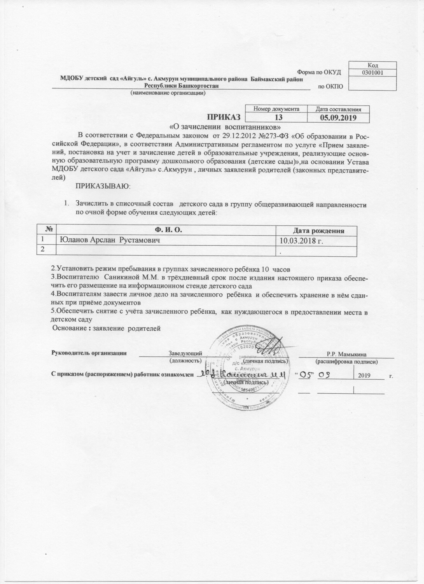 Приказ №1 о зачислении Кутлубердиной Рианы
